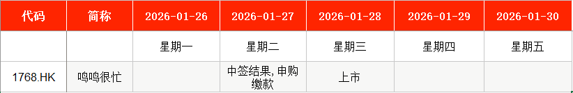 港股方面,Wind数据显示,本周(1月26日至1月30日),鸣鸣很忙(01768.HK)将于本周三上市。