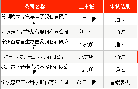 其中,拟在上交所主板IPO的芜湖埃泰克汽车电子股份有限公司(下称“埃泰克”),拟在创业板IPO的无锡理奇智能装备股份有限公司(下称“理奇智能”),拟在北交所IPO的常州百瑞吉生物医药股份有限公司(下称“百瑞吉”)、弥富科技(浙江)股份有限公司(下称“弥富科技”)、拓普泰克技术股份有限公司(下称“拓普泰克”)等,均成功过会。
