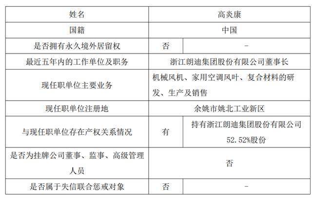 高炎康,72岁,现任朗迪集团(SH:603726)董事长,持有后者52.52%股份。