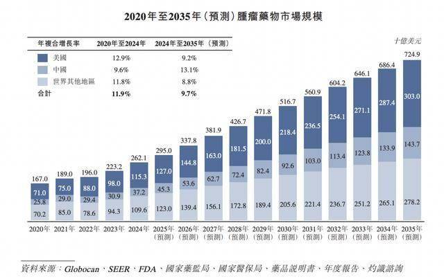 根据灼识咨询的资料,全球肿瘤治疗药物市场规模由2020年的1670亿美元增至2024年的2621亿美元,年复合增长率为11.9%,预计2035年将达到7249亿美元,2024年至2035年的年复合增长率为9.7%。在中国,市场规模由2020年的258亿美元增至2024年的372亿美元,预计到2035年将达到1437亿美元,2024年至2035年的年复合增长率为13.1%。