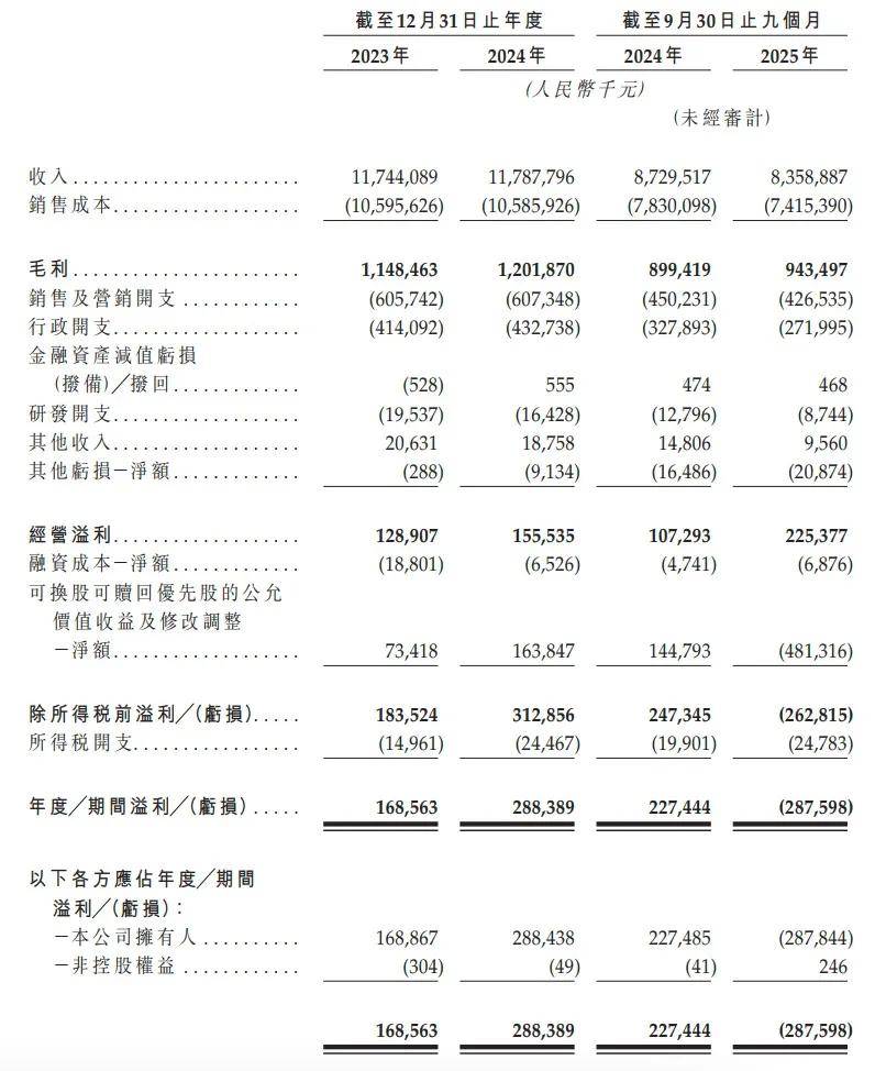 但在当前激烈的市场竞争下,拥有百亿规模的钱大妈同样面临挑战。招股书显示,2025年前9个月公司营收83.6亿元,净亏损2.88亿元。而2023年至2024年,钱大妈分别实现净利1.69亿元和2.88亿元。