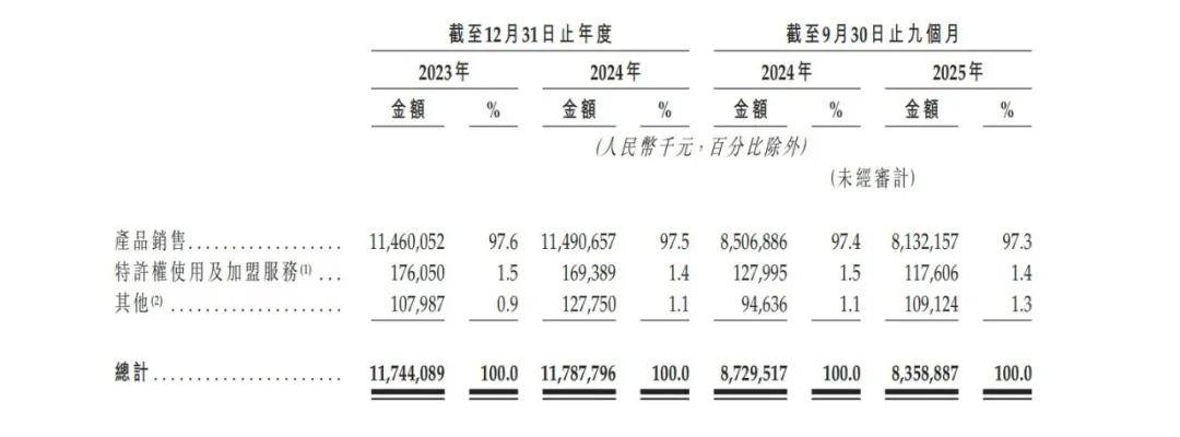 按照销售渠道划分收入来源,向加盟商销售收入占钱大妈营收来源的绝对大头,2024年以及2025年前9个月,向加盟商销售收入分别为111.404亿元和79.547亿元,占总收入的94.5%以上。也就是说,加盟商对钱大妈定向采购的产品支出是后者的营收支柱。