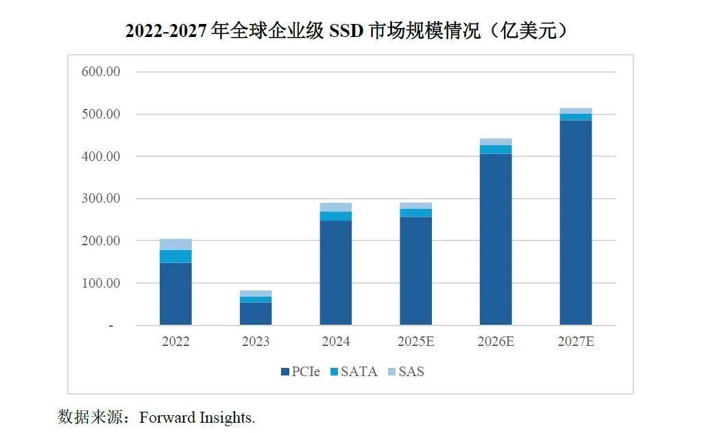 从全球市场维度看,企业级 SSD 已成为数据中心存储体系的重要组成部分。根据 Forward Insights 统计,随着存储行业需求提振持续增长,预计到 2027 年市场规模将达到 514.18 亿美元,年复合增长率约为 20.25%。在产品结构方面,PCIe 接口企业级 SSD 占据主导地位,且占比持续上升,其在数据中心等终端场景中的应用覆盖率不断提高,成为企业级存储的主流技术路径。