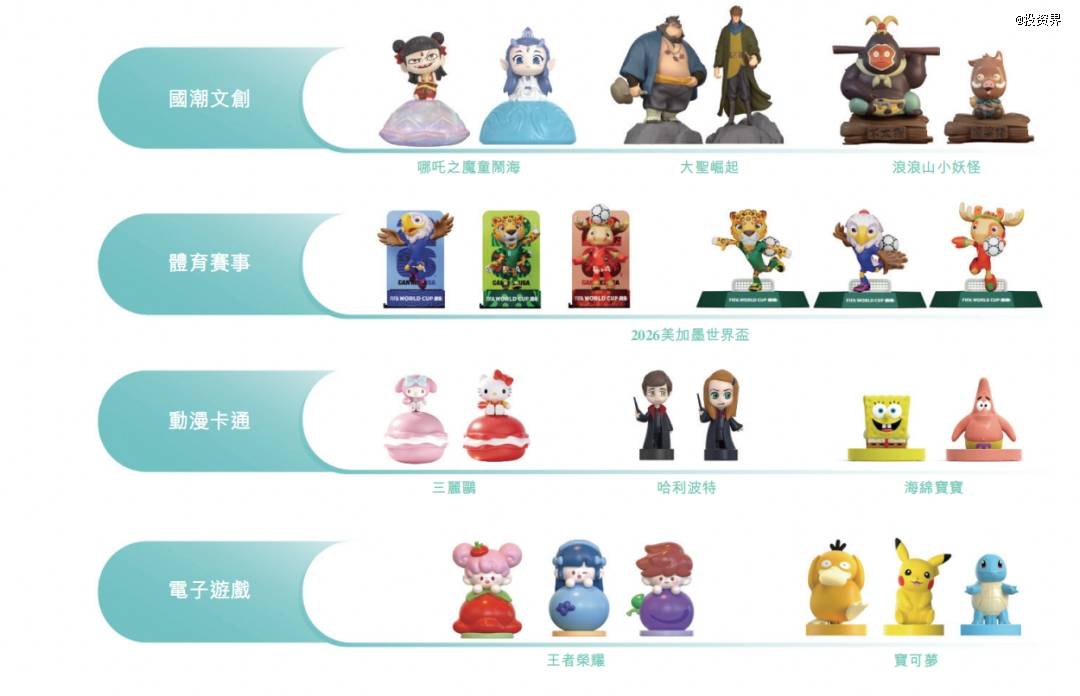 桑尼森迪的策略是,与知名IP合作。截至2025年9月30日,桑尼森迪与超过20个IP达成授权合作,共交付217个IP玩具产品SKU。包括国潮文创、体育赛事、动漫、电子游戏等IP类别。