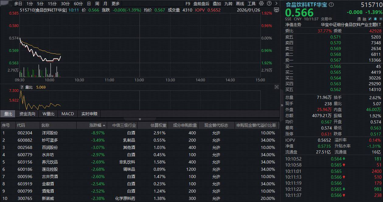 1月26日,吃喝板块继续回调,反映吃喝板块整体走势的食品饮料ETF华宝(515710)开盘后震荡下行,截至发稿,场内价格跌1.39%。