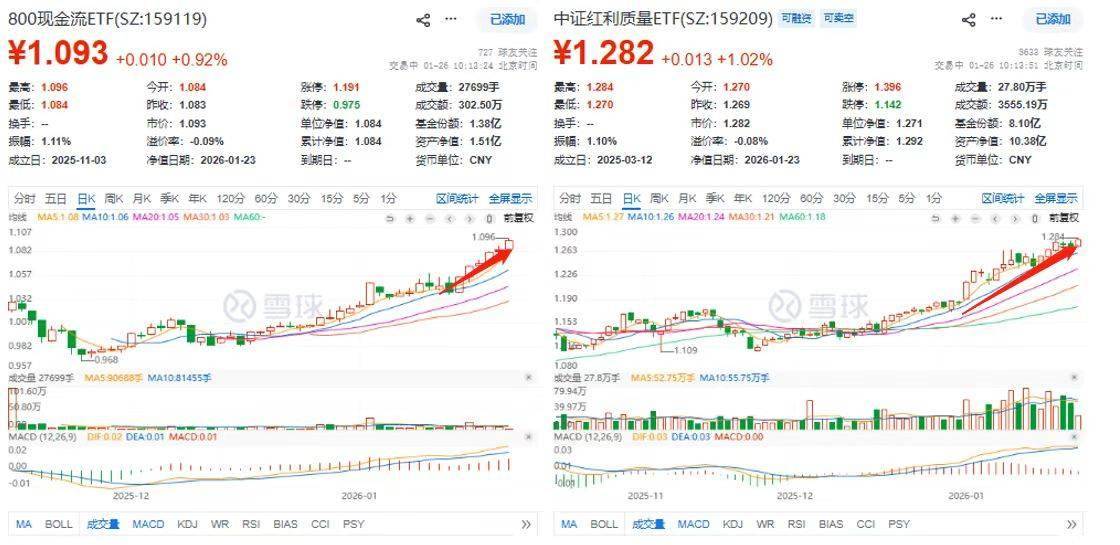 1月26日,“高质量红利”截至10时8分,低费率中证红利质量ETF(159209)、800现金流ETF(159119)分别跌0.87%、0.83%,一度分别涨1.18%、1.20%联袂冲击历史新高。二者持续获资金加仓,分别连续11日、6日净流入!