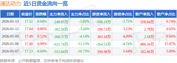 1月13日的资金流向数据方面,主力资金净流出249.85万元,占总成交额3.02%,游资资金净流出308.19万元,占总成交额3.72%,散户资金净流入558.04万元,占总成交额6.74%。