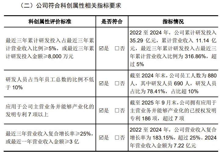 2022 至 2024 年,公司累计研发投入35.29 亿元,累计营业收入 11.14 亿元,最近三年累计研发投入占最近三年累计营业收入比例为 316.86%。截至 2024 年末,公司员工人数为 880人,其中研发人员 690 人,研发人员占比为 78.41%。截至 2025 年 9 月末,公司拥有应用于主营业务并能够产业化的已授权发明专利 186 项。