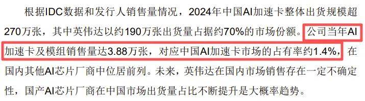 根据IDC数据和发行人销售量情况,2024年中国AI加速卡整体出货规模超270万张,其中英伟达以约190万张出货量占据约70%的市场份额。公司当年AI加速卡及模组销售量达3.88万张,对应中国AI加速卡市场的占有率约1.4%,在国内其他AI芯片厂商中位居前列。未来,英伟达在国内市场销售存在一定不确定性,国产AI芯片厂商在中国市场出货量占比不断提升是大概率趋势。