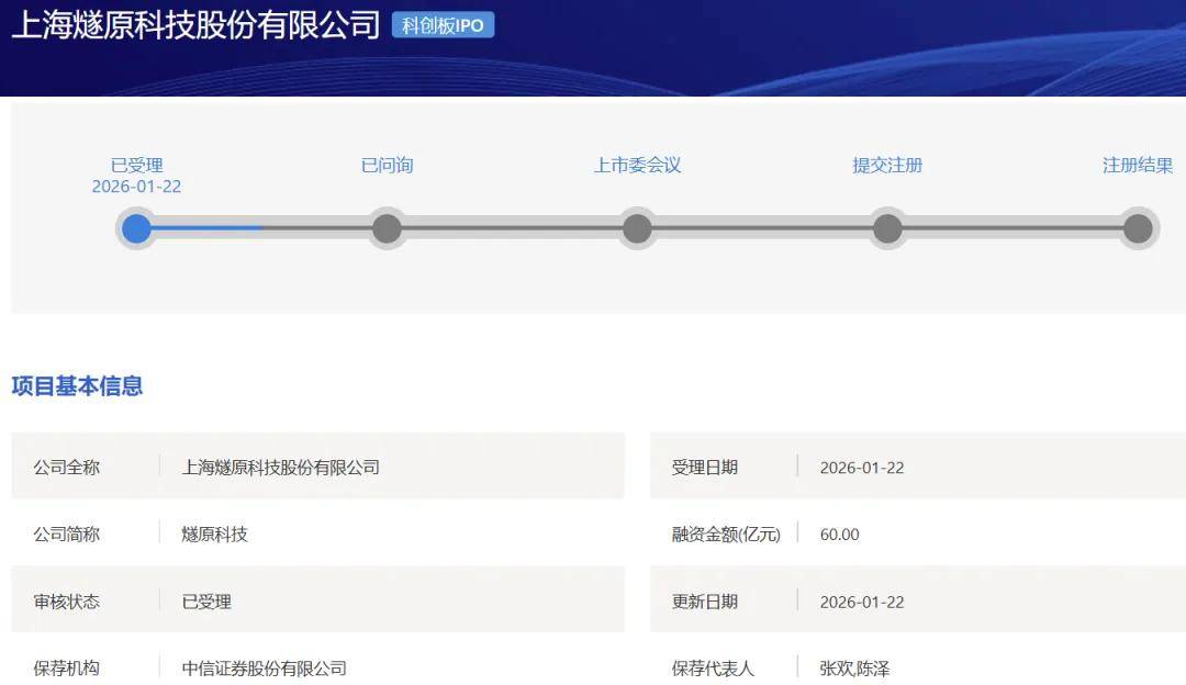 1月22日,上海燧原科技股份有限公司科创板IPO获上交所受理,成为2026年第一家被受理的科创板IPO公司。公司本次IPO拟融资60亿元,保荐机构为中信证券。