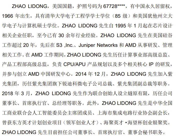 ZHAO LIDONG先生,美国国籍,有中国永久居留权,1966 年出生,具有清华大学电子工程学学士学位(85 级)和美国犹他州立大学电子与计算机硕士学位,目前担任公司董事长、首席执行官、董事会秘书职务。
