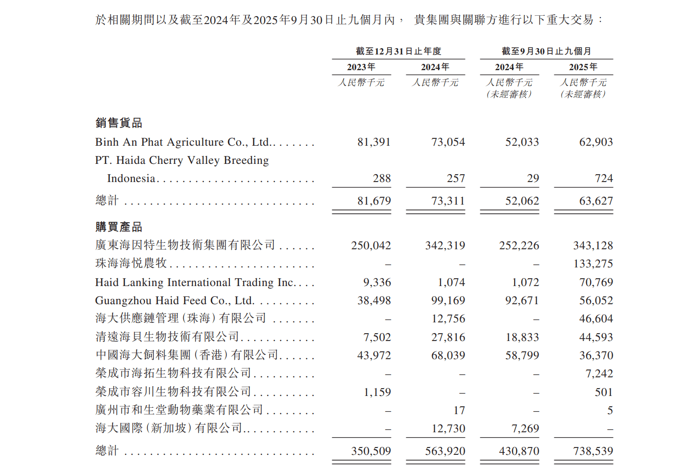 招股书显示,2023年和2024年以及2025年前三季度,海大国际从各关联方购买产品的关联交易金额分别为3.5亿元、5.6亿元以及7.4亿元。2024年关联交易金额同比增长超过60%,2025年前三季度又超过70%。