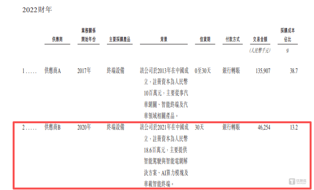 采购端的供应商依赖度则更为突出,且同样出现了合作时间线矛盾的问题。无独有偶,在福信富通供应商体系中也出现了类似的情形。报告期内,福信富通向前五大供应商采购的金额分别为27216.8万元、33810.4万元、40039.9万元、70039万元,分别占当期采购总额的77.5%、84.9%、89.5%、66.4%,其中供应商B常年位列公司第二大供应商,2022-2024年对其采购金额分别为4625.4万元、12638.5万元、14175.7万元,占采购总额比例达13.2%、31.7%、31.7%,采购占比逐年提升且保持高位。但据公司披露,双方自2020年起开展业务合作,而供应商B实际于2021年才在中国成立,注册资本1860万元,主营智能驾驶、智能电网解决方案等业务,这与销售端的问题如出一辙,供应商B尚未设立时,福信富通便与其开启了合作。