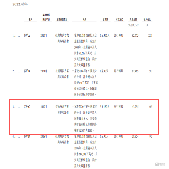 而其中存在明显的逻辑矛盾,2022年公司第三大客户为客户C,当年对其销售收入达4399.5万元,据公司披露,双方自2019年起开展业务合作,但客户C实际于2020年才在中国成立,注册资本4100万元,主营智能座舱及车联网终端解决方案,这意味着客户C尚未设立,福信富通便与其建立了业务关系,时间线存在明显冲突。