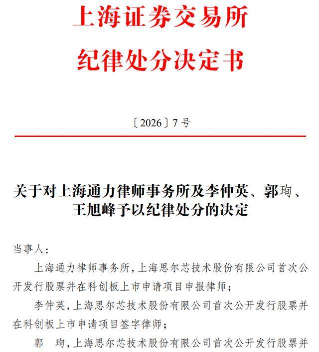 日前,上海证券交易所发布《关于对上海通力律师事务所及李仲英、郭珣、王旭峰予以纪律处分的决定》。上海思尔芯技术股份有限公司(以下简称“思尔芯”)曾向上交所申请首次公开发行股票并在科创板上市,后撤回发行上市申请。根据中国证监会《行政处罚决定书》查明的事实,上海通力律所作为项目申报律师,李仲英、郭珣、王旭峰作为项目签字律师,存在两大违规行为。