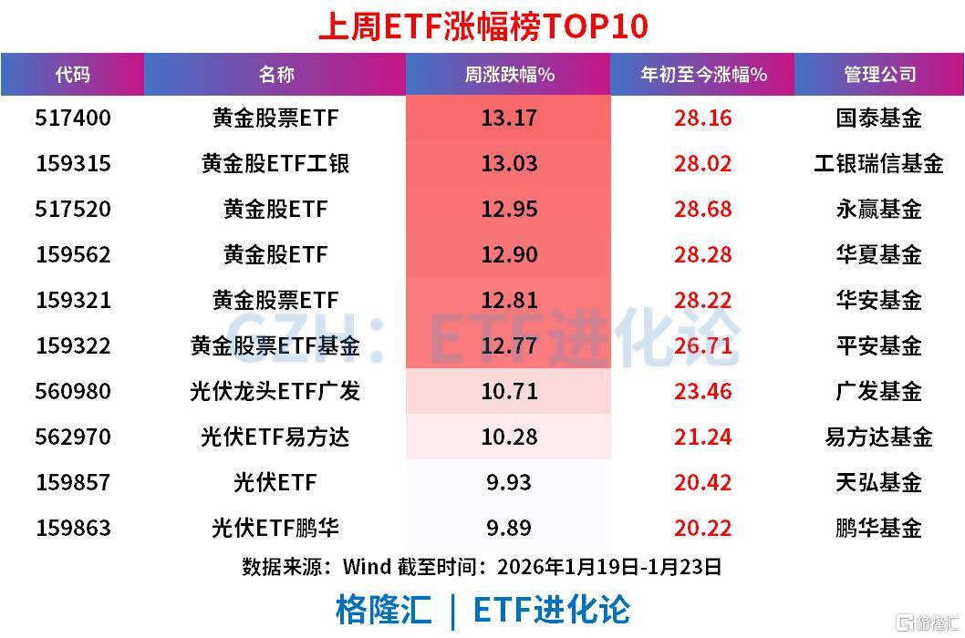 黄金股票ETF、黄金股ETF工银、黄金股ETF、黄金股ETF、黄金股票ETF、黄金股票ETF基金、光伏龙头ETF广发、光伏ETF易方达上周分别涨13.17 %、13.03 %、12.95 %、12.90 %、12.81 %、12.77 %、10.71 %、10.28 %。