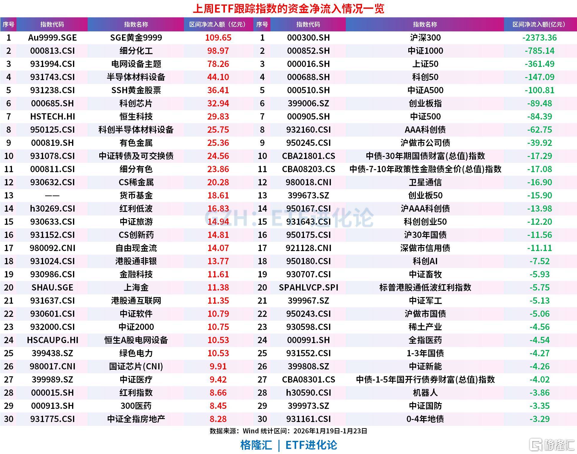 指数方面,SGE黄金9999、细分化工、电网设备主题、半导体材料设备、SSH黄金股票、科创芯片、恒生科技、科创半导体材料设备分别净流出109.65 亿元、98.97 亿元、78.26 亿元、44.10亿元、36.41亿元、32.94 亿元、29.83 亿元和25.75 亿元。