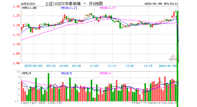 1月8日,上证180ETF华泰柏瑞(530300)开盘涨0.24%,报1.273元。上证180ETF华泰柏瑞(530300)重仓股方面,贵州茅台开盘跌0.00%,紫金矿业跌1.42%,恒瑞医药涨1.80%,药明康德涨0.79%,中国平安跌0.11%,寒武纪涨1.01%,中芯国际跌0.79%,工业富联涨0.25%,招商银行涨0.12%,海光信息涨1.46%。