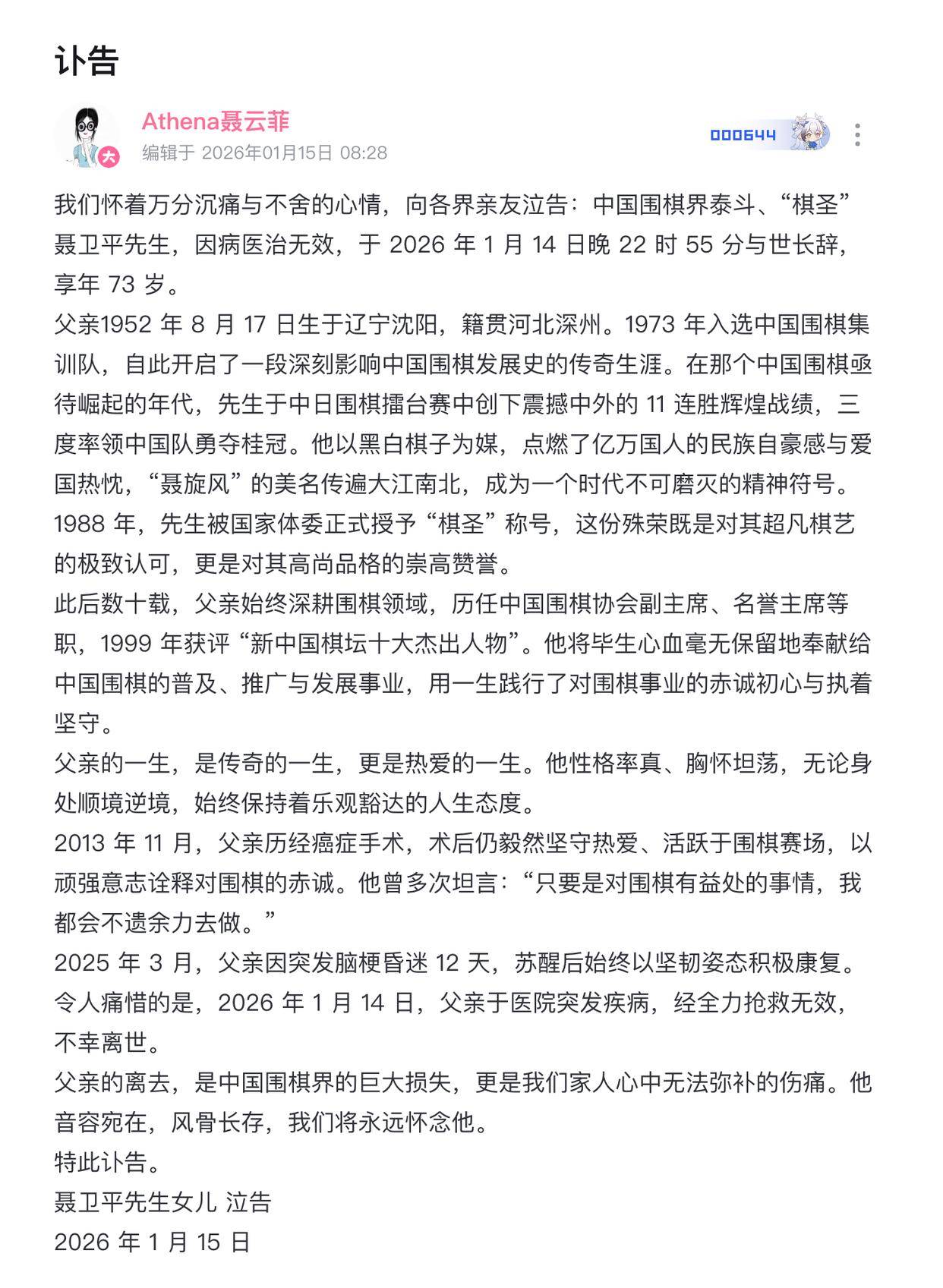 2026年1月14日22时55分,73岁的聂卫平在北京离世。他的一生被无数棋局定义——11连胜的擂台神话、三度率队击败日本、被授予“棋圣”称号的巅峰时刻。但真正让这个名字沉入人心的,不只是他落下的千万手棋,而是那些未曾记录在谱中的瞬间:对女儿的温柔凝视、对弟子的点拨教诲、与老友半世纪的相知相守。他以棋为舟,渡人渡己,也悄然重塑了一个时代的围棋精神。