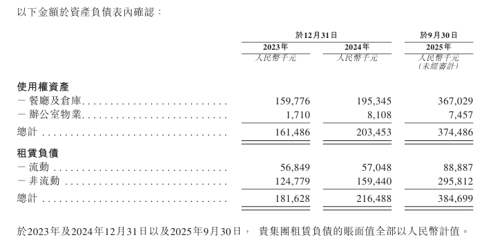 截至2025年9月末,公司合并资产总额9.01亿元,较2024年末增长62.6%,较2023年末大增120%。同期,公司非流动资产总额达到6.56亿元,较2024年末近乎翻倍。其中,使用权资产(即门店长期租赁权)从2024年末的2.03亿元激增至3.75亿元,增幅84%,反映的便是线下门店网络的迅猛铺设。与此同时,物业、厂房及设备从1.12亿元增长至2.4亿元,增长率114%,反映出其在中央厨房、生产设备等后端基础设施上的持续重投入。