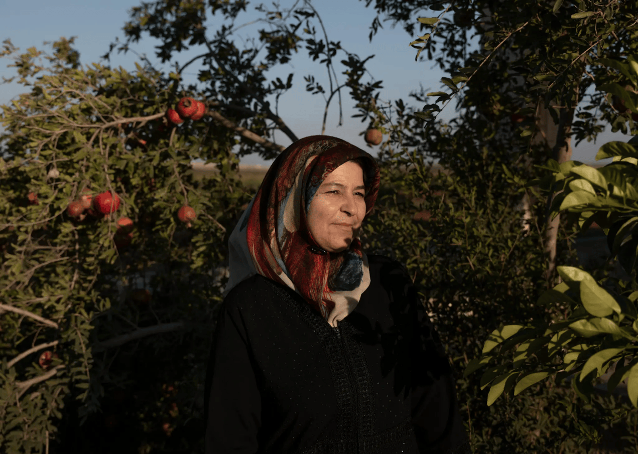 Hala Mahmoud Almahmoud 在叙利亚拉塔米纳附近的家门外。她收到了 500 美元加密货币的援助,能帮助她重开农场。