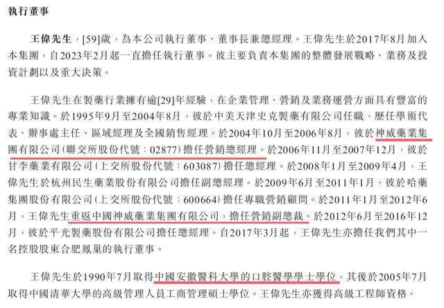 王伟,59岁,康诺生物执行董事、董事长兼总经理。王伟毕业于中国安徽医科大学的口腔医学专业,之后获清华大学工商管理硕士。早年任职中美天津史克制药、神威药业。当时在神威药业任职营销总经理。