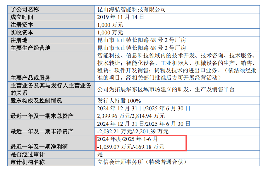 据悉,海昌智能盈利能力下滑与其核心子公司昆山海弘亏损有关。招股书显示,昆山海弘成立于2019年,是海昌智能拓展华东区域市场建立的研发、生产及销售平台。2024年,昆山海弘净亏损达1059.07万元,净资产为-2032.21万元,同比减少1059.07万元。