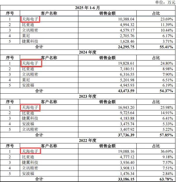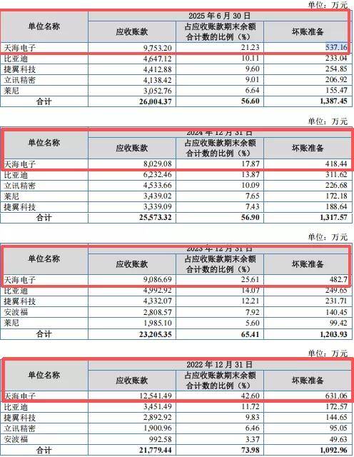 值得注意的是,海昌智能对天海电子应收账款最多,2022年至2025年上半年分别为12541.49万元、9086.69万元、8029.08万元、9753.20万元;占应收账款期末余额合计数的比例分别为42.60%、25.61%、17.87%、21.23%;坏账准备分别为631.06万元、482.7万元、418.44万元、537.16万元。