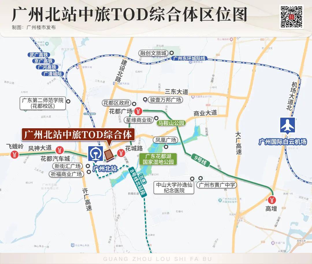 而广州北站中旅TOD综合体,选址就在花都区广州北站东广场区域(建设北路以西、云山大道以南),整体规划为住宅、商业两大核心板块。