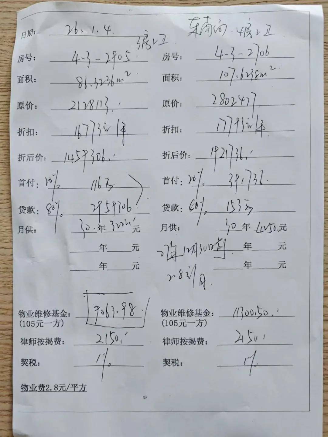 按照现场价格来算,4-3栋29楼86方的三房两卫,折后价约146万,单价约1.68万/平;27楼107方的四房两卫折后价约192万,单价约1.78万/平。