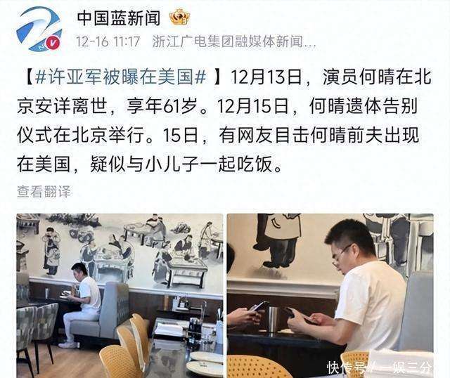 何晴的告别仪式于2025年12月15日上午,在北京昌平殡仪馆的久安厅举行。最初,这个仪式是只计划邀请亲友参加的,但由于众多粉丝的请求,最终决定对外开放。现场的参与者包括亲属和一些影迷,他们在悼念簿上写下对何晴的思念,很快,悼念簿就被填满。何晴的儿子许何出席了仪式,戴着口罩,眼睛红肿,情绪显得非常悲伤。在致悼词时,许何提到母亲喜欢雪,特别指出2025年12月12日北京的初雪,仿佛是为她而降。亲友们在现场纷纷流露出悲痛之情。仪式的最后,许何捧着母亲的遗像和骨灰盒,完成了告别环节。仪式结束后,他离开了场地,继续处理一些后续事务。 与许何一同经历这一刻的,除了亲友外,许亚军并未出席该仪式。当天,有网友在美国一家餐厅偶遇许亚军,他正陪着小儿子一起用餐。通过IP地址的定位,也确认了许亚军当时身处美国。网友们分享的照片中,许亚军穿着白色短袖和白色裤子,戴着眼镜,低头看着手机,似乎在和某人聊天,眉头紧锁。小儿子坐在对面,也在看手机,桌上则摆放着一些食物。这个偶遇发生的时间恰好是中午,与北京的告别仪式时间重合。媒体随后报道称,许亚军当时在洛杉矶,此次露面也引发了广泛关注。