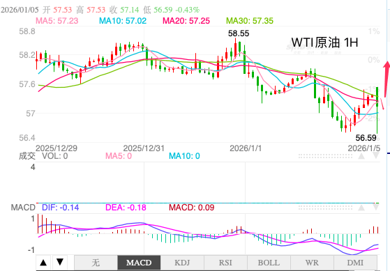 原油短线(1H)走势二次下探56.60低点,K线收长下影线实体阴线,预示下方买盘动能充足。均线系统被油价反复穿越,短线客观趋势方向为震荡节奏。从主趋势方向看呈向上,主客观方向矛盾下,预计日内原油走势上行,关注58对油价的阻力作用。
