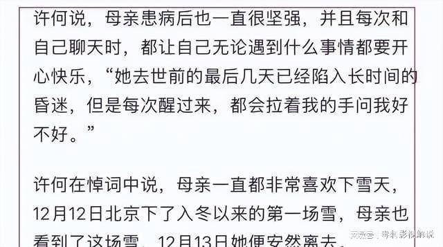 许何作为何晴的儿子,在母亲生病后调整了自己的生活安排。闺蜜在文章中提到,许何在十四岁时从父亲家中搬出来,选择和母亲一起生活,目的是更好地照顾母亲的日常需要。尽管之前有报道称许何成年后独立租房生活,闺蜜指出,这种说法是为了维护家庭体面而做的,实际情况是许何一直与母亲保持着紧密的联系,并在母亲需要时给予支持。在母亲的最后几年里,许何积极参与母亲的护理工作,包括陪同她看病以及处理家庭琐事,这一段时间持续了大约十年。