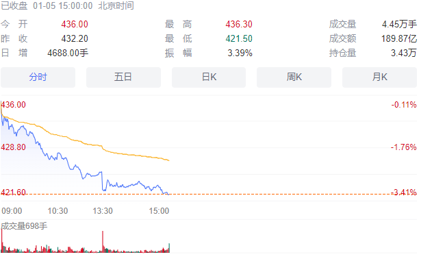 与 WTI 原油的窄幅震荡不同,1 月 5 日美国天然气期货呈现 “单边下挫” 的行情,成为当日能源期货市场中跌幅最大的品种。亚市早盘 9:00.美国天然气期货主力合约以 3.05 美元 / 百万英热开盘,较前一交易日收盘价(3.055 美元 / 百万英热)基本持平,但开盘后迅速遭遇抛售,10:00 跌至 3.00 美元 / 百万英热,跌幅 1.8%;11:30.EIA 公布的截至 12 月 19 日当周美国天然气库存数据显示,该周天然气库存减少 1660 亿立方英尺,虽高于前一周的减少 1670 亿立方英尺,但低于市场预期的减少 1800 亿立方英尺,库存降幅不及预期引发市场对 “美国天然气需求疲软” 的担忧,价格快速跌至 2.947 美元 / 百万英热,跌幅超 3%,成交量达 32 万手,较前一交易日同期增长 45%。