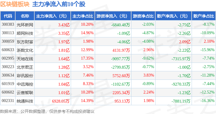 从资金流向上来看,当日区块链板块主力资金净流出102.86亿元,游资资金净流入13.79亿元,散户资金净流入89.07亿元。区块链板块个股资金流向见下表: