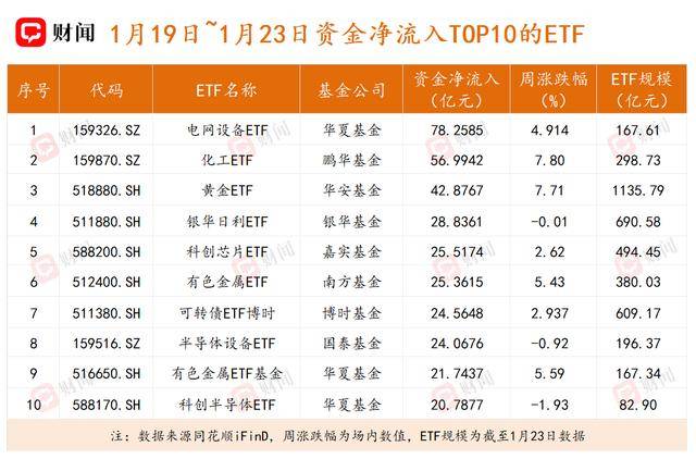 与宽基ETF的大规模净流出形成鲜明对比的是,行业主题ETF整体呈现资金净流入态势,上周合计净流入104.37亿元。其中,电网设备ETF(159326.SZ)以78.26亿元的净流入位居首位;化工ETF(159870.SZ)和黄金ETF(518880.SH)分别录得56.99亿元和42.88亿元的净流入。