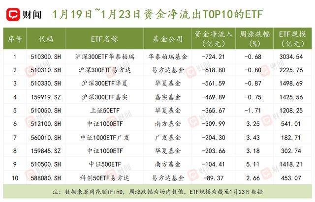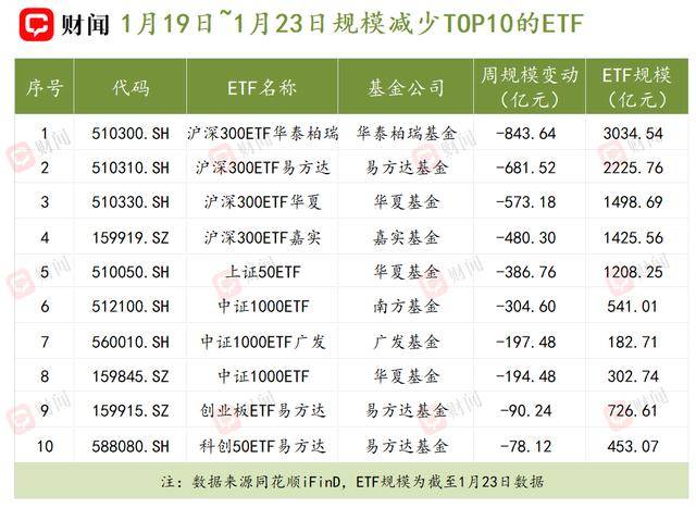 另一方面,在规模缩减的产品中,华泰柏瑞沪深300ETF(510300.SH)当周规模减少843.64亿元,截至1月23日仍以3034.54亿元的规模稳居全市场首位,继续领跑全市场ETF产品。
