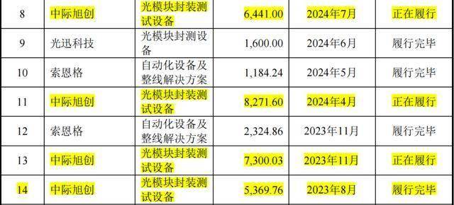 招股书披露,2022年4月-2025年5月,中际旭创与猎奇智能先后签下了6笔代表性的光模块封装测试设备采购订单,合同金额累计3.34亿元,单笔最高达8271.60万元。特别是2023年8月、11月,2024年4月、7月,密集签下了4笔总价在5000万以上的光模块封装测试设备合同。