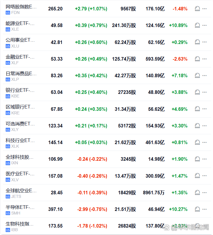 网络股指数ETF涨1.07%,能源业ETF涨0.79%,银行业ETF涨0.4%,科技行业ETF大致持平,全球科技股指数ETF跌0.22%,半导体ETF跌0.75%,生物科技指数ETF跌1.02%。