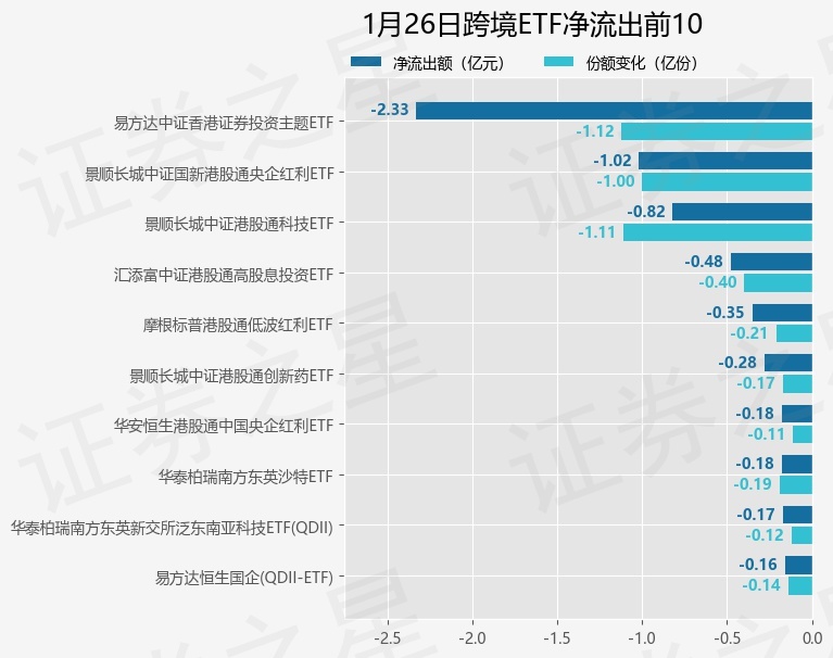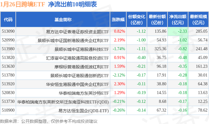 当日有31只跨境ETF基金出现资金净流出,其中净流出排首位的是易方达中证香港证券投资主题ETF(513090),份额减少了1.12亿份,净流出额为2.33亿元。