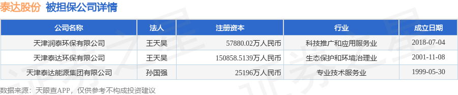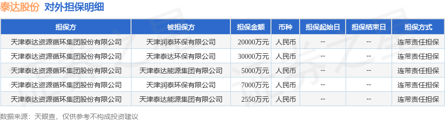 泰达股份1月7日披露5笔对外担保,被担保公司3家。对外担保明细如下表: