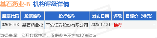 截至2026年1月23日收盘,基石药业-B(02616.HK)报收于5.65港元,上涨5.61%,成交量1198.18万股,成交额6679.28万港元。投行对该股的评级以推荐为主,近90天内共有1家投行给出推荐评级。平安证券股份有限公司最新一份研报给予基石药业-B推荐评级。