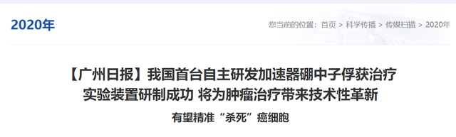 2020年8月,中科院高能物理研究所在广东东莞成功研发出我国首台加速器硼中子俘获治疗实验装置。这标志着我国BNCT技术研发取得重大突破。