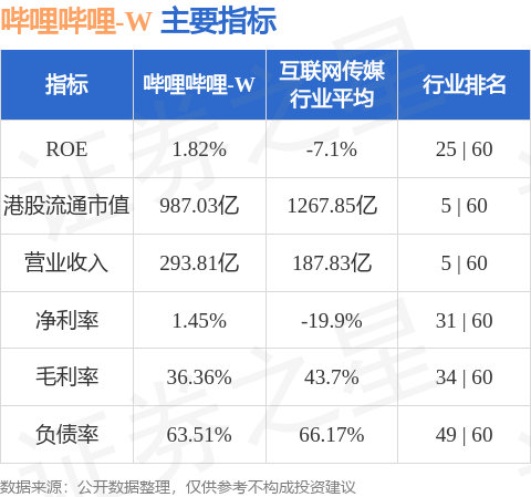 哔哩哔哩-W港股市值987.03亿港元,在互联网传媒行业中排名第5。主要指标见下表: