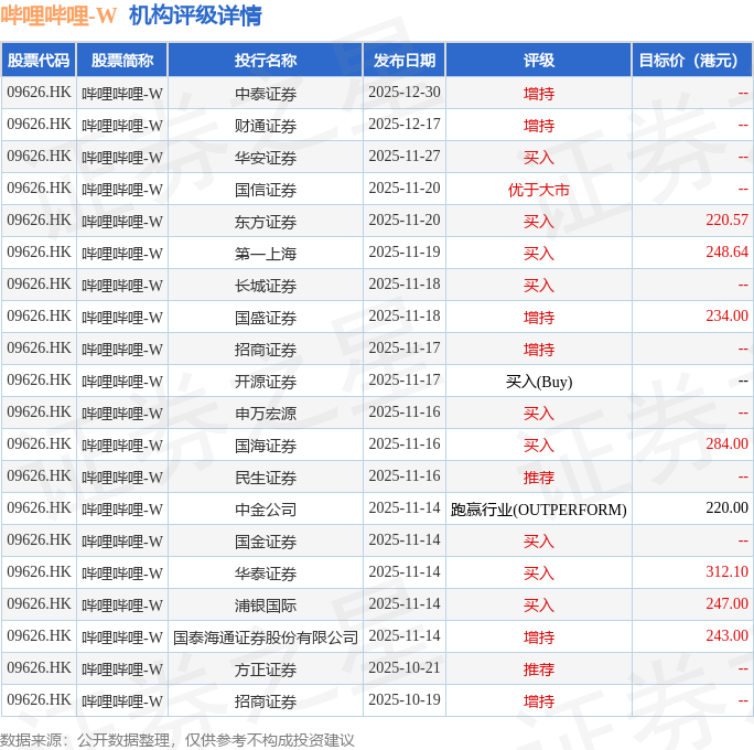 投行对该股的评级以买入为主,近90天内共有9家投行给出买入评级,近90天的目标均价为251.16港元。中泰证券最新一份研报给予哔哩哔哩-W增持评级。