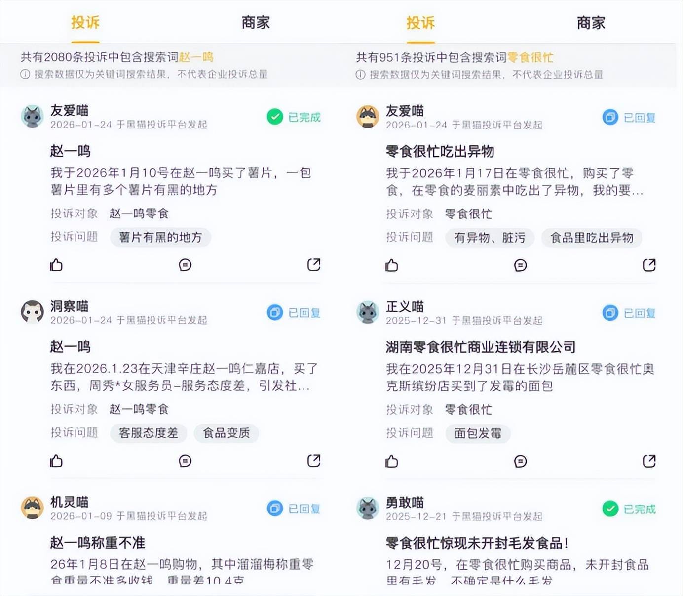 记者查询发现,截至2026年1月25日,鸣鸣很忙旗下“赵一鸣零食”与“零食很忙”两大品牌在“黑猫投诉”平台累计收到消费者投诉2100余起,部分消费者投诉其食品安全问题,比如出现黑色薯片、零食中有异物、面包发霉等,还有消费者投诉其店员服务态度差、零食称重不准等问题。