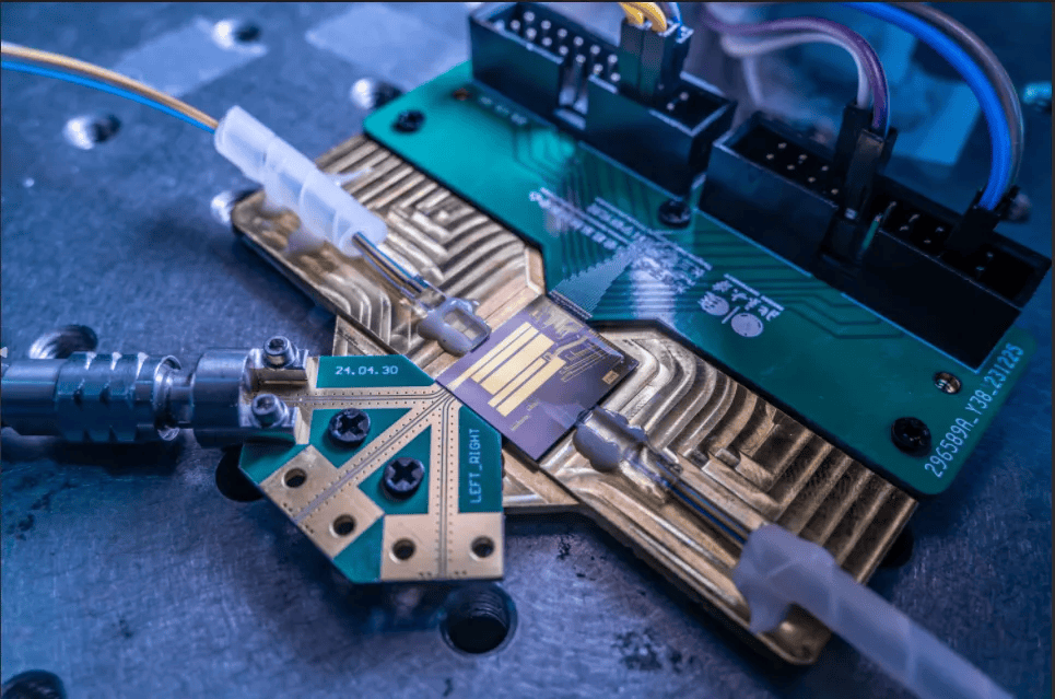 研究团队制备的超宽带光电融合芯片。北京大学供图