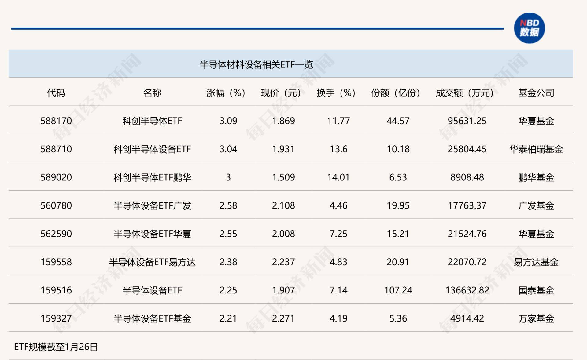 点评:科创半导体设备ETF(588710)、科创半导体ETF鹏华(589020)以及科创半导体ETF(588170)今日上午涨幅均达到3%,其中,科创半导体ETF(588170)份额较大,达到44.57亿份,其半日成交金额为9.56亿元。上述三只ETF均追踪的是上证科创板半导体材料设备主题指数。