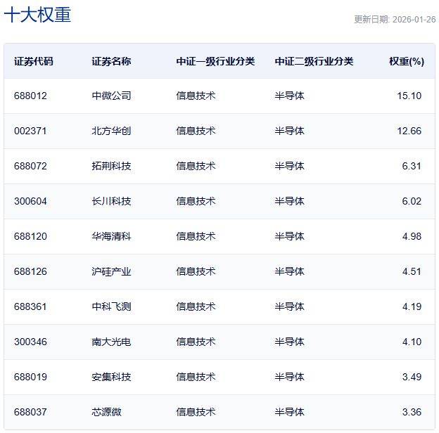 中证半导体材料设备主题指数主要权重股