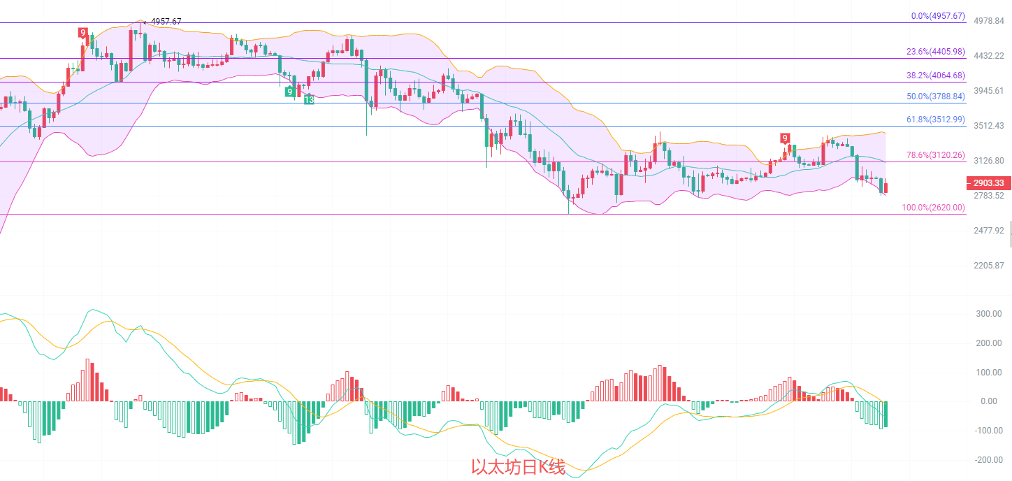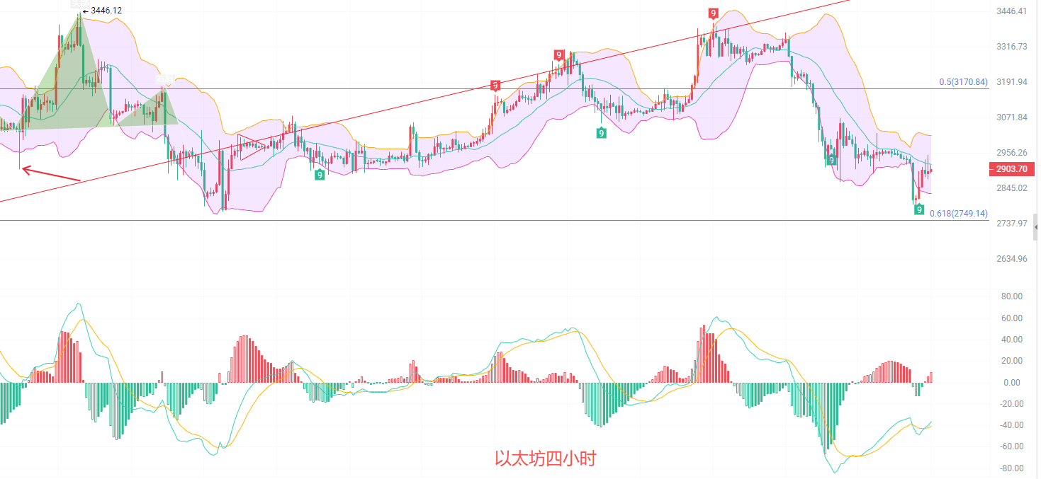 日K线发稿前最高2950,最低2810,EMA趋势指标向下扩散空势不变,EMA15已经抵达了3030,MACD连续缩量,DIF和DEA跌入0轴线下方,K线从布林带下轨2790反弹到了2900,距离中轨31000还有一段距离,短线有回调需求,2800北上的币友可以在主力冲击3000关口的时候减持,没有北上的等机会南下